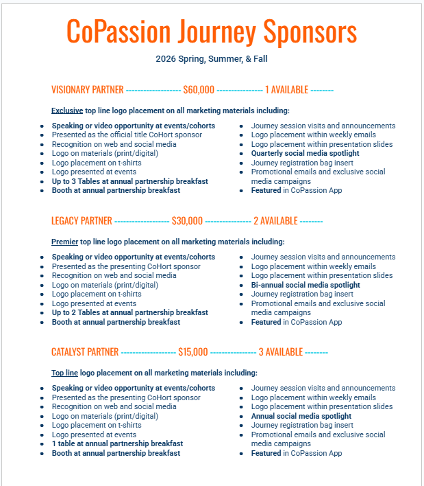 There are many ways to become a sponsor for the CoPassion Journey. In addition, to various levels of financial sponsorship, we are also looking for In-Kind sponsors for giveaways, meals, meeting space, marketing, volunteering, and more! For more information about becoming a sponsor or for assistance in creating a customized sponsorship opportunity, please contact Ray Strickland or Zach Melton, Business Development Team Leaders at CoPassion.
